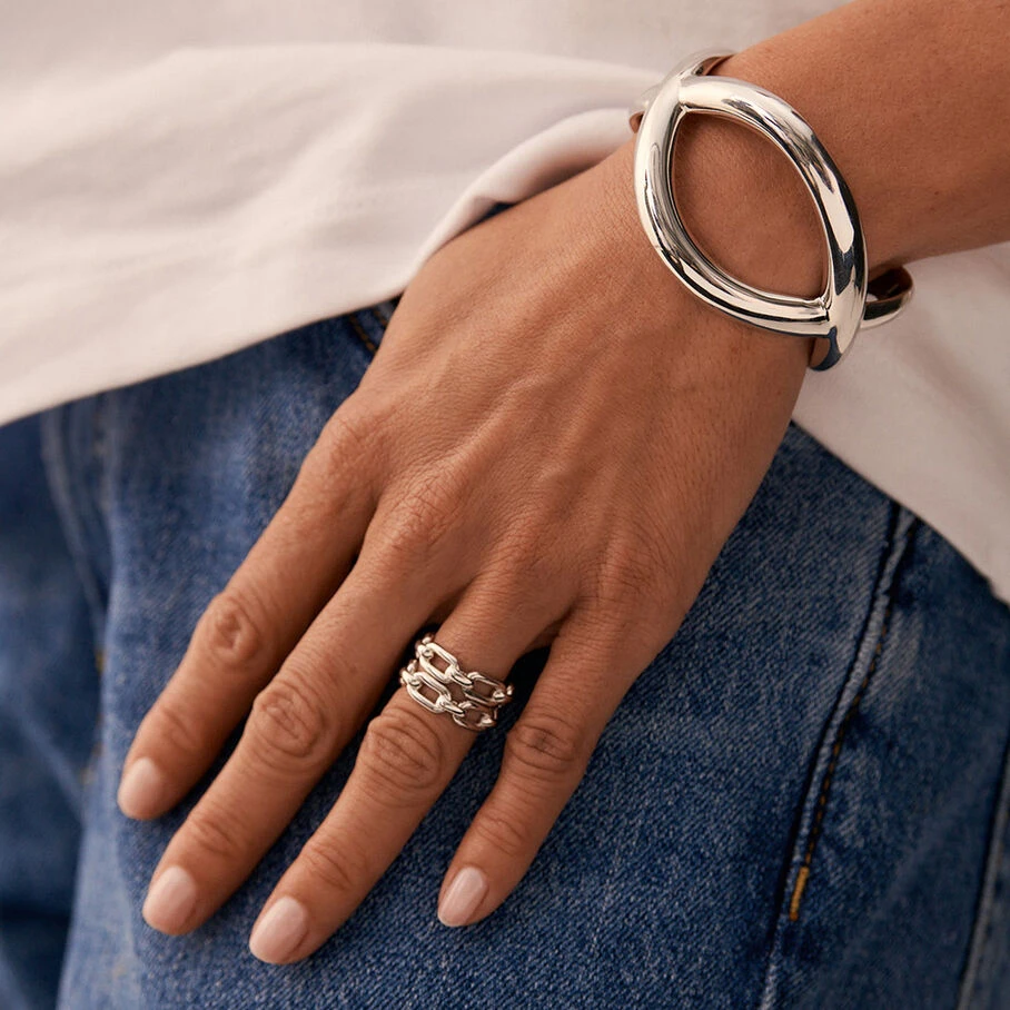 Bague ouverte en argent véritable formée d’une maille rectangulaire rigide. PM: 48/50 – MM: 52/54 – GM: 56/58