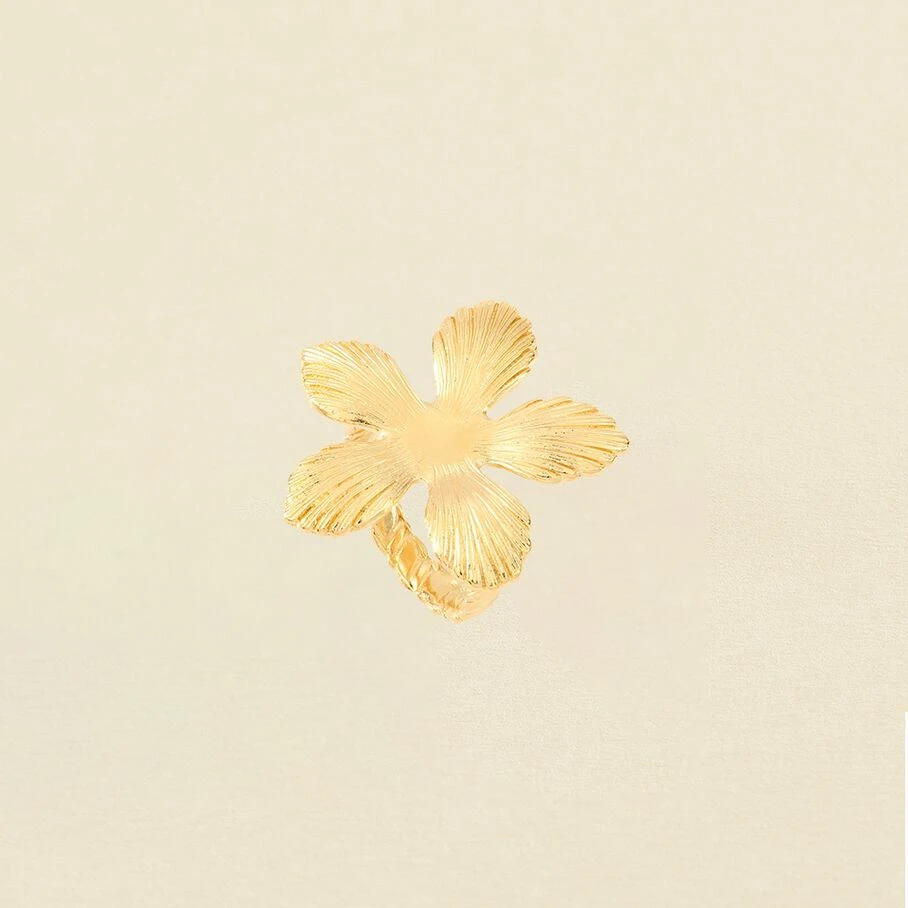Bague ouverte, grande fleur en métal plaqué or.