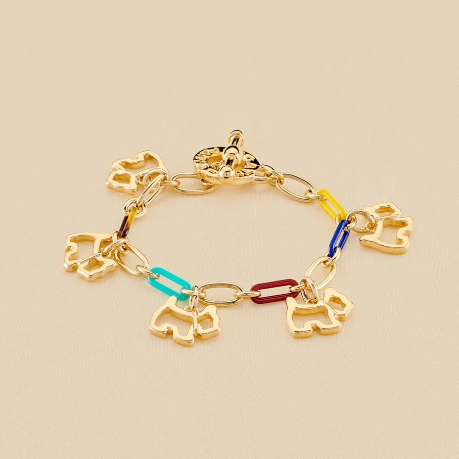 Bracelet, en métal doré 750/1000, maillons ovales dont certains sont en acetate, 5 chiens évidés en breloque et fermoir barrette