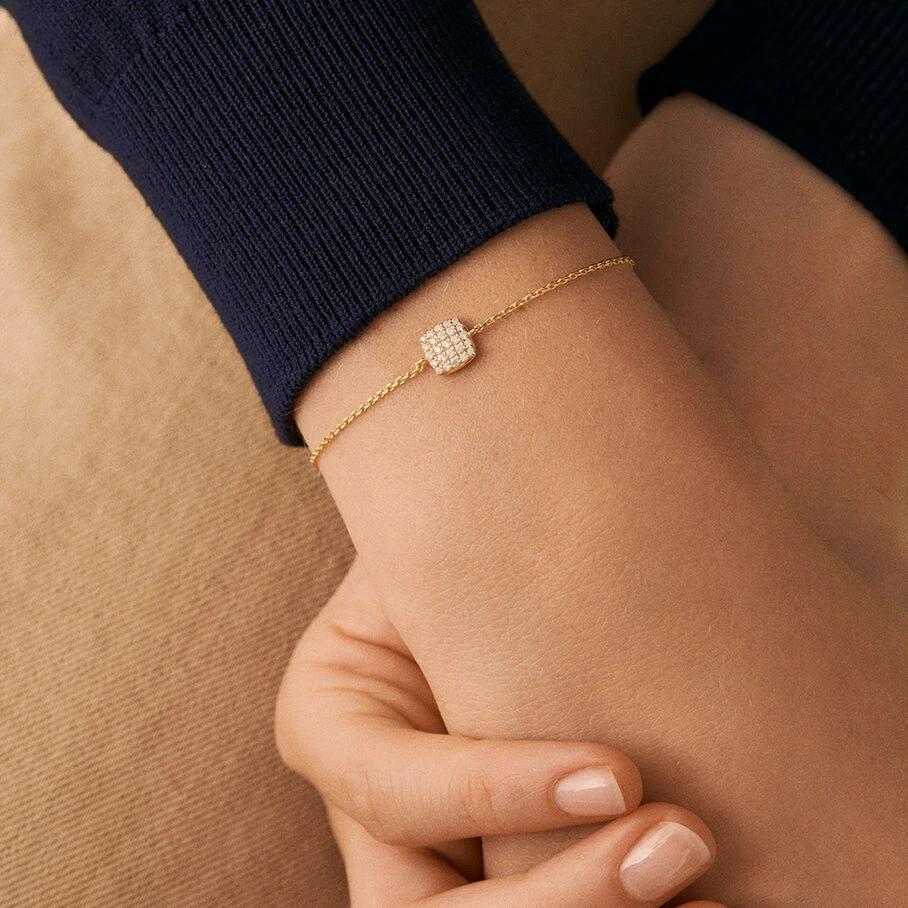 Bracelet chaine, en argent véritable doré 750/1000, avec un pendentif en forme de coussin serti d’oxydes de zirconium