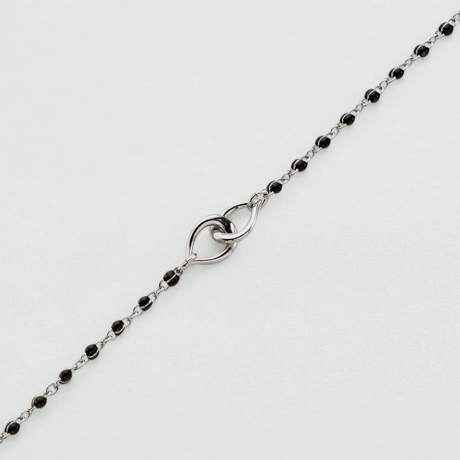 Bracelet, en laiton rhodié, perles d’émail sur chaine et deux anneaux gouttes entrelacés