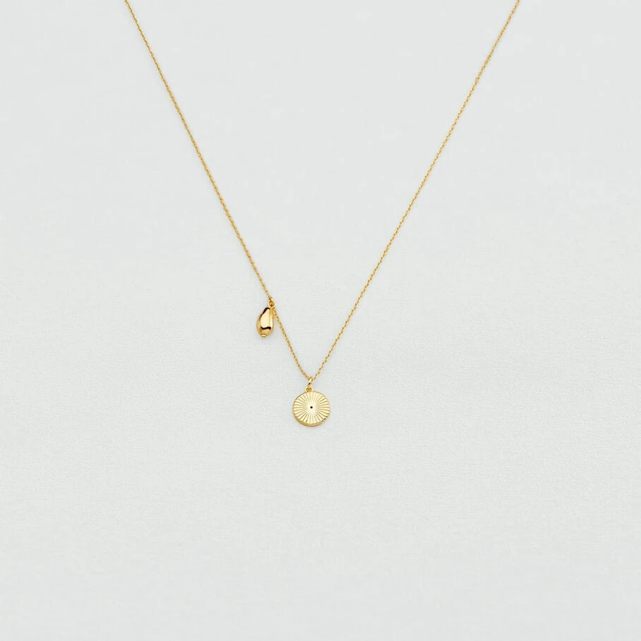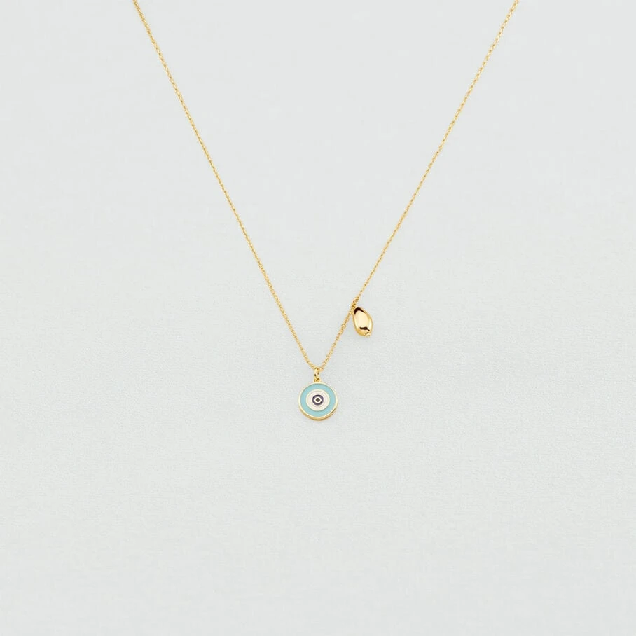 Collier court, en laiton doré à l’or fin, avec un œil turc et un coquillage sur chaine en pendentifs