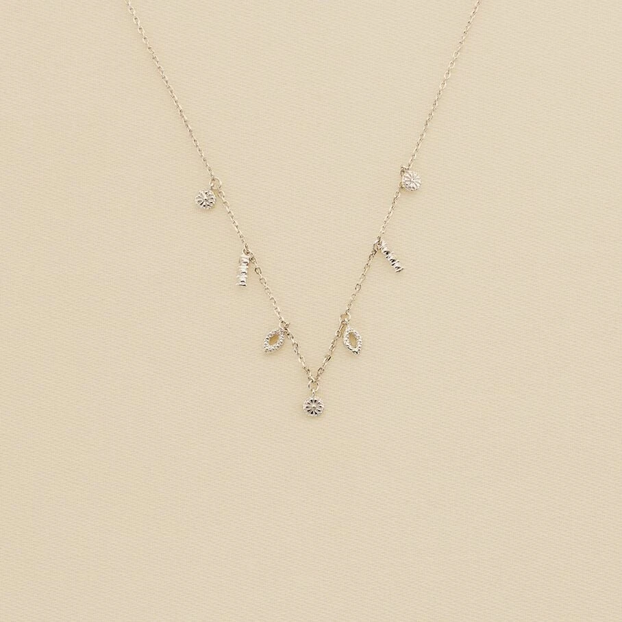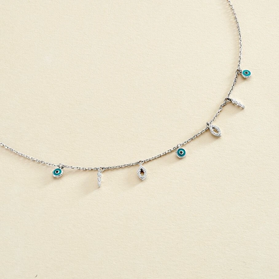 Collier chaine maille forçat, en argent véritable 925/1000, orné de différentes pampilles: Œils turcs, oxydes de zirconium…