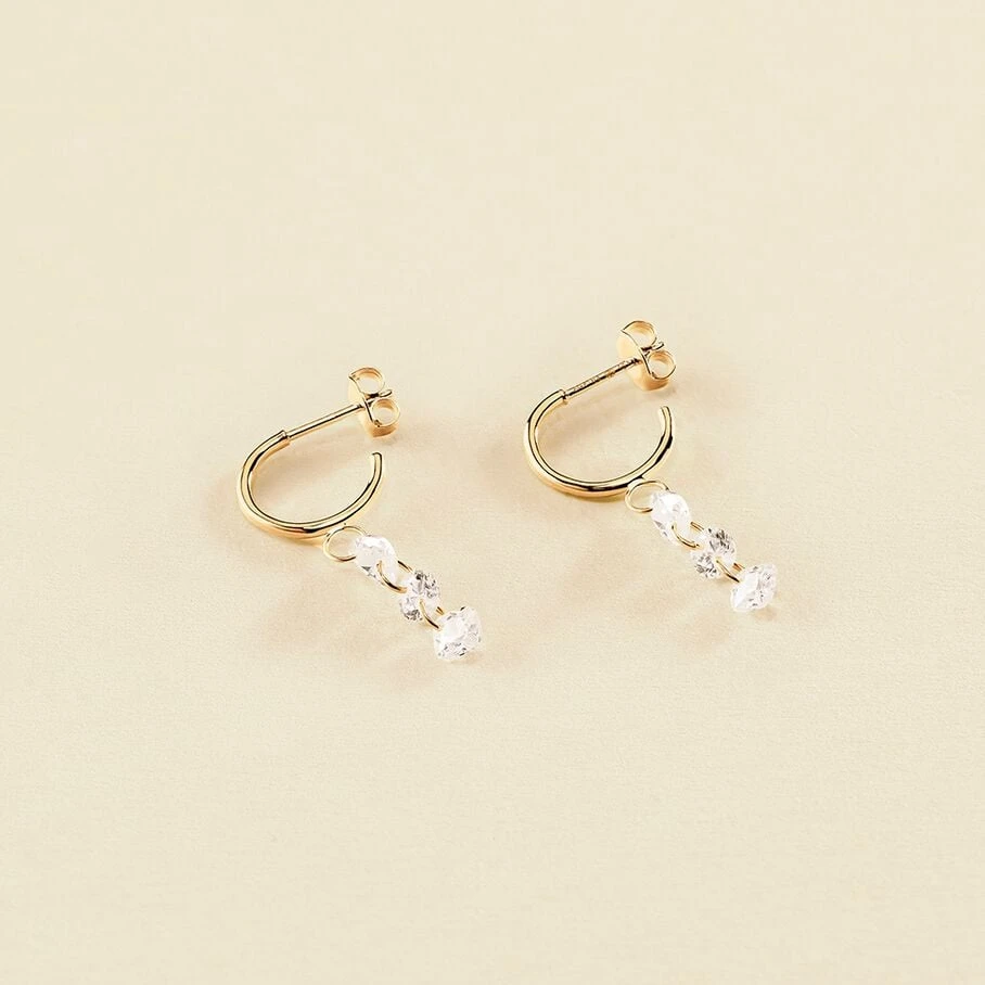 Créoles de 12 mm de diamètre, en argent véritable doré 750/1000, avec en pampille une trilogie d’oxydes de zirconium percés en formes de poire, rond et coussin
