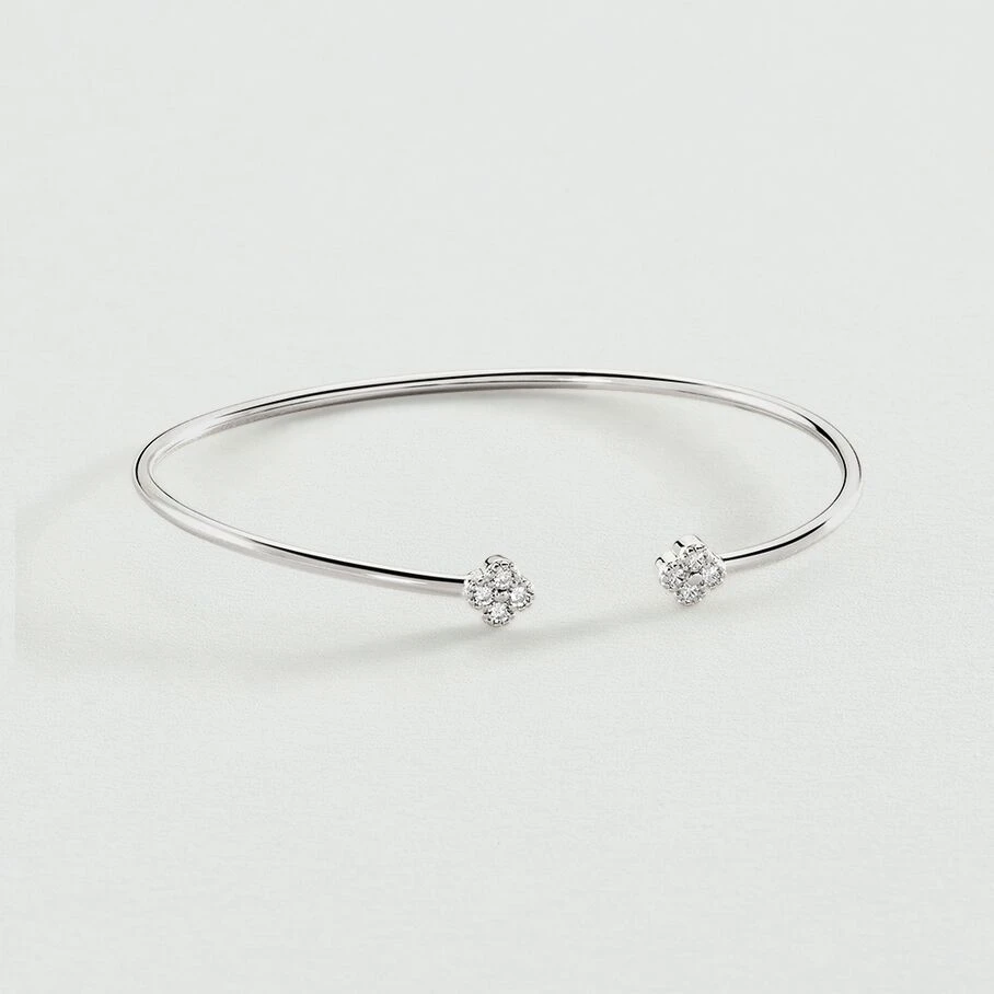 Jonc fin ouvert, en argent véritable, avec des fleurs d’oxydes de zirconium aux extrémités et un fin graineti sur le pourtour