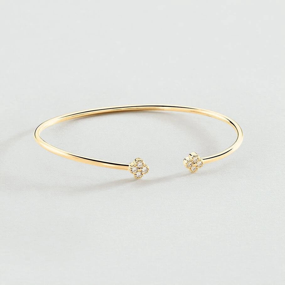 Jonc fin ouvert, en argent véritable doré 750/1000, avec des fleurs d’oxydes de zirconium aux extrémités et un fin graineti sur le pourtour