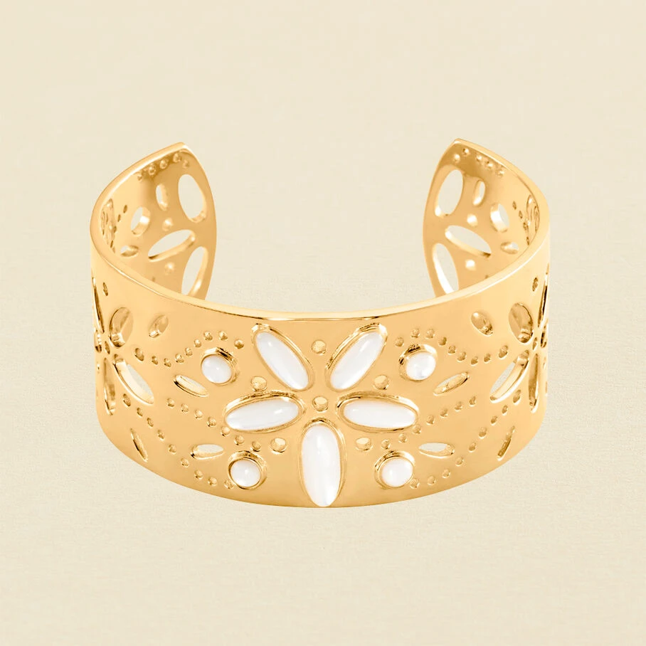Manchette large en laiton doré 750/1000 ornée de motifs sun dollars et de nacre