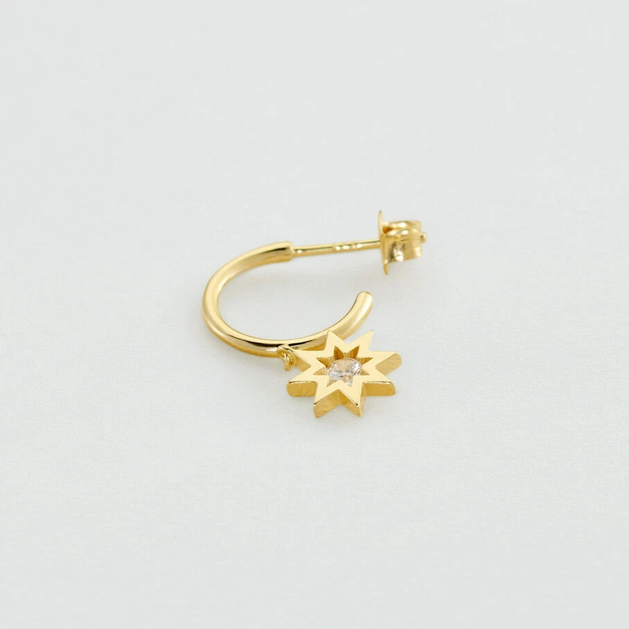 Créole, en argent doré 750/1000, grande étoile avec un oxyde de zirconium au centre. A l’unité pour mieux les mixer et les accumuler.