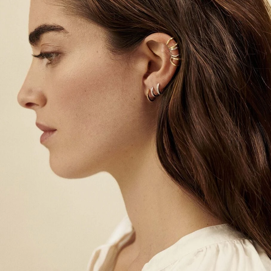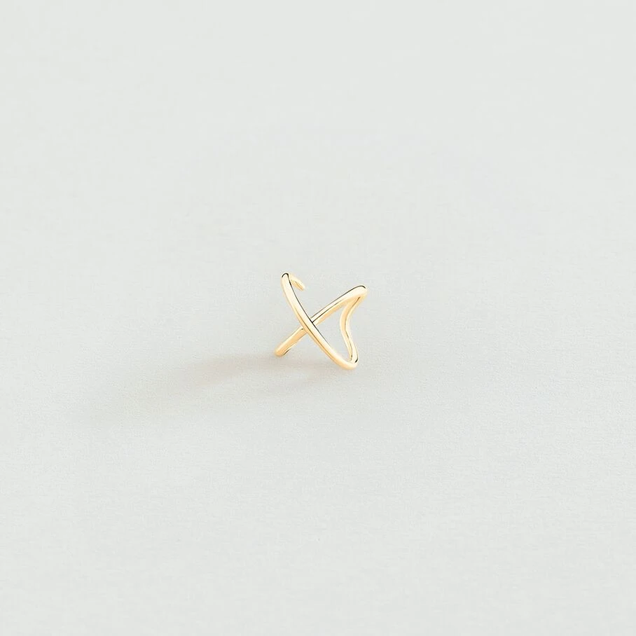 Faux piercing en argent doré à l’or fin, bague d’oreille en fils croisés. A l’unité, pour mieux les mixer et les accumuler.