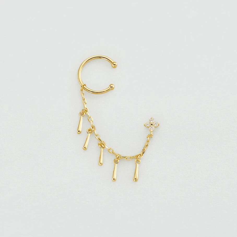 Earcuff, en argent doré 750/1000, fleur pavée d’oxydes de zirconium reliée à un faux piercing anneau par une chaine ayant des gouttes en pampilles. A l’unité.