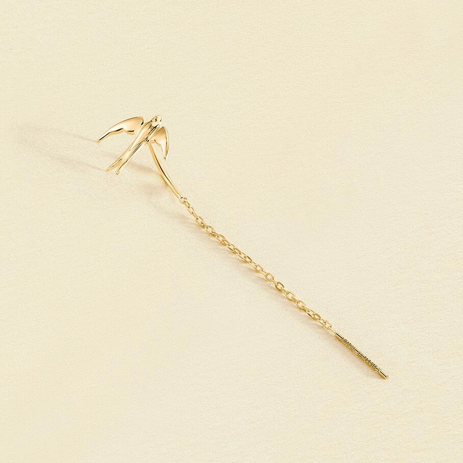 Boucle d’oreille pull trough, oiseau sur le devant et chaine longue à l’arrière de l’oreille, en argent doré 750/1000. A l’unité, pour mieux les mixer et les accumuler.