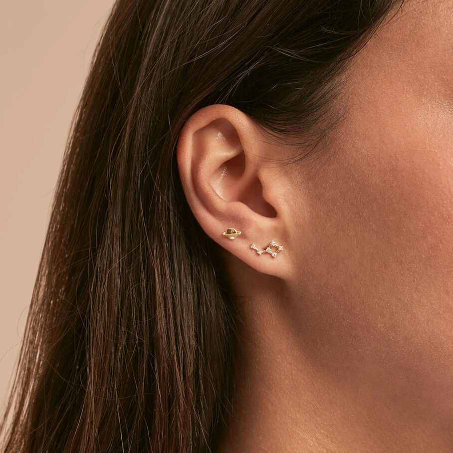 Boucle d’oreille puce, en argent doré 750/1000, constellation avec des oxydes de zirconium. A l’unité pour mieux les mixer et les accumuler.