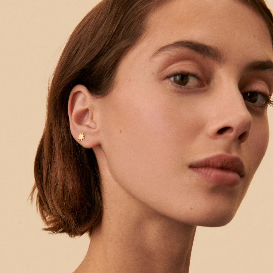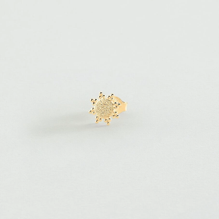 Boucle d’oreille, soleil anec un effet sablé brillant, en argent doré 750/1000. A l’unité pour mieux les mixer et les accumuler.