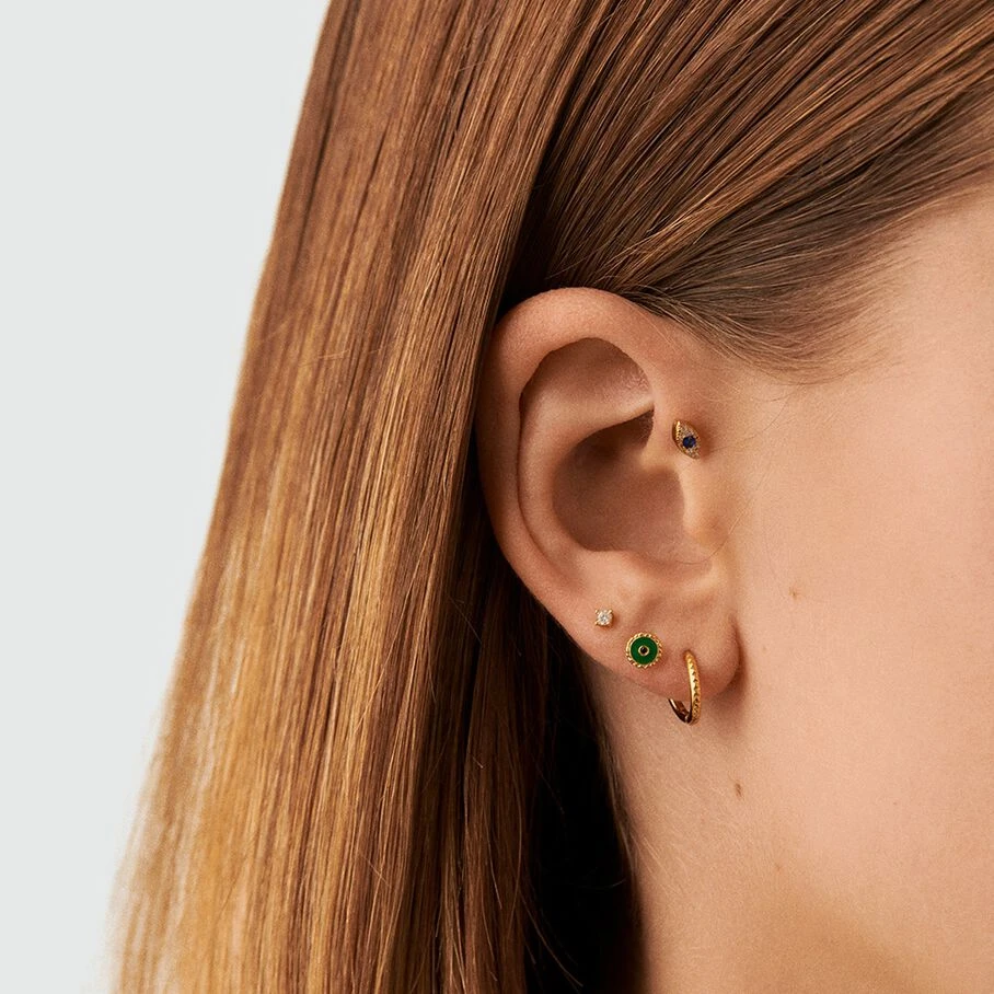 Boucle d’oreille puce à l’unité, en argent 925/1000 doré 750/1000, en forme d’œil turc. L’iris émaillé et le contour de l’œil serti d’oxydes de zirconium apportent un vrai raffinement et éclat au produit!