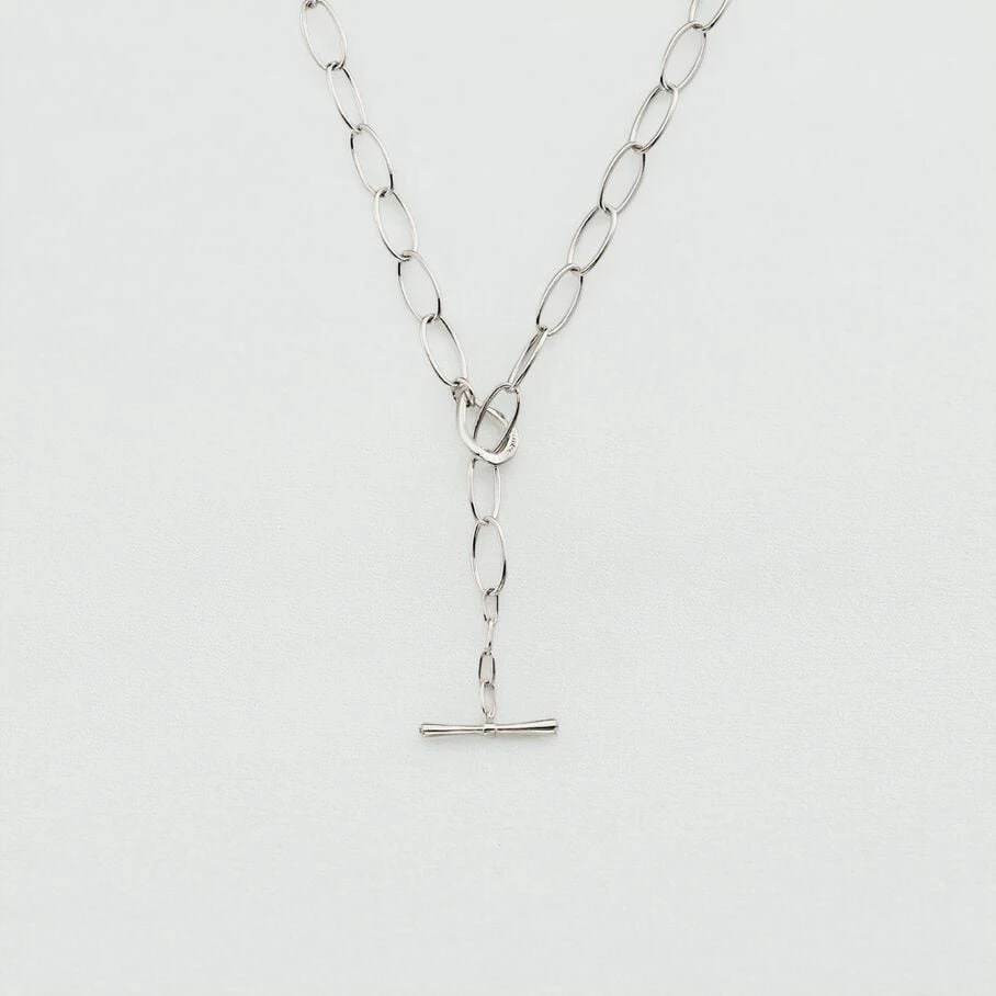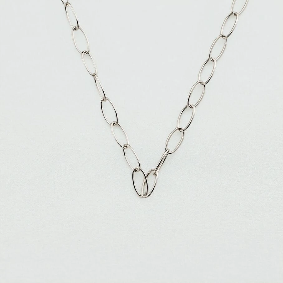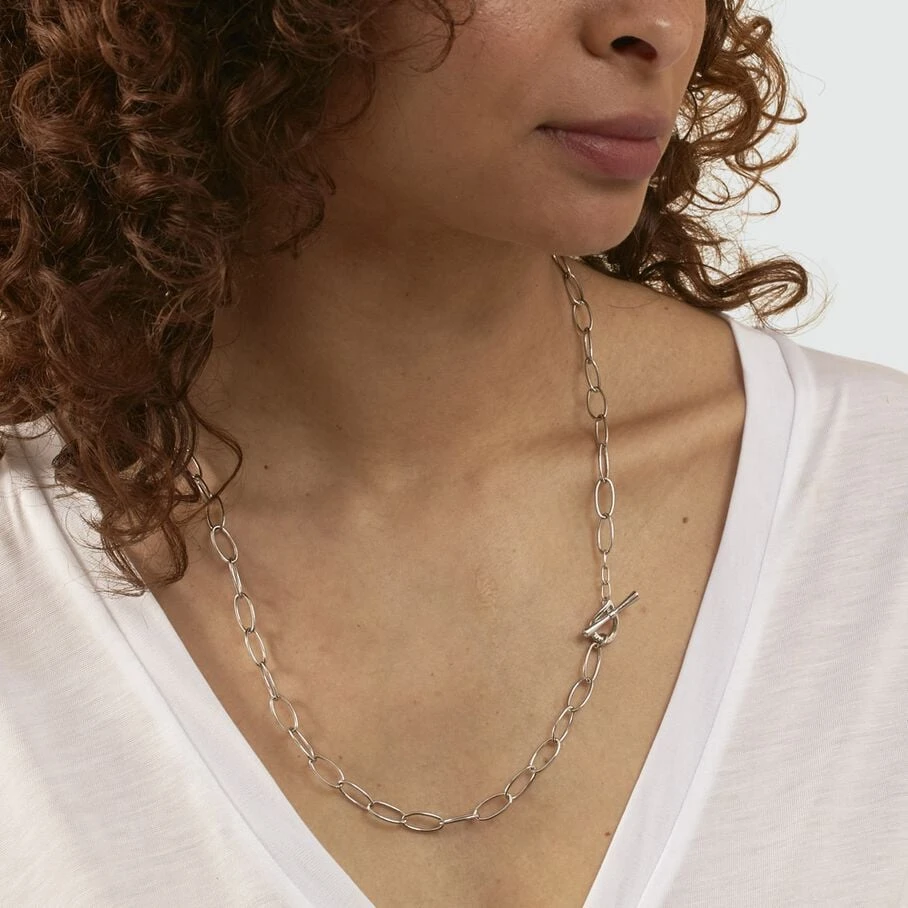 Collier multi-portés, en laiton rhodié, constitué de maillons ovales allongés. Il peut se porter aussi bien en collier mi-long qu’en collier Y!