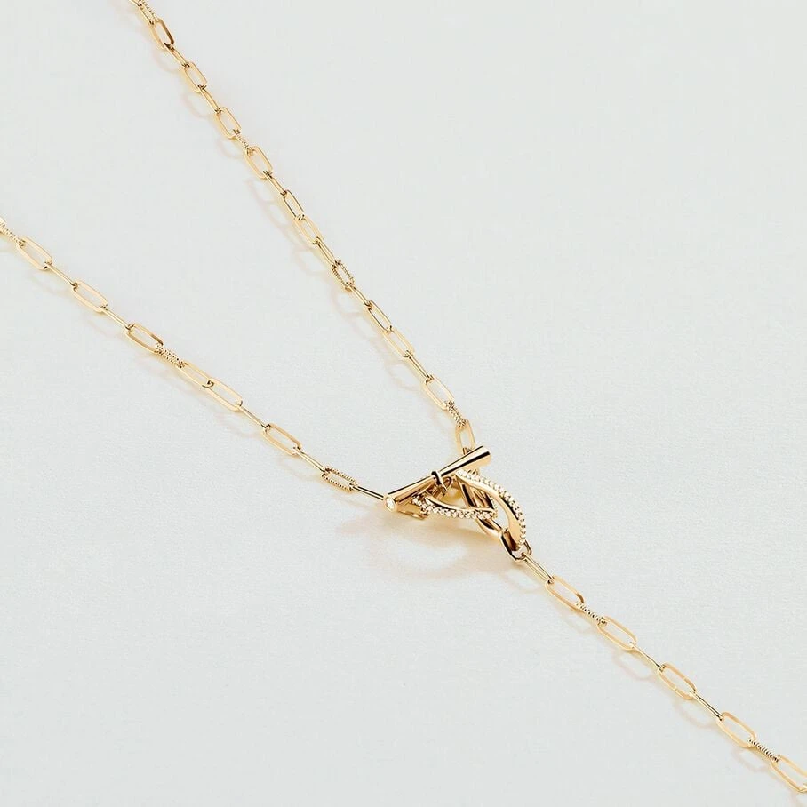 Collier Y, en argent véritable doré à l’or fin, fait de maille dont le fermoir représente deux gouttes entrelacées et serties d’oxydes de zirconium sur la tranche extérieure
